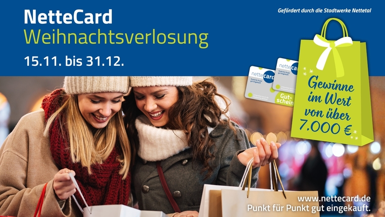 Sichern Sie sich vom 15. November bis 31. Dezember 2025 mit Kauf bei einem NetteCard-Partner Zusatz-Lospunkte zu Ihrem Einkauf.